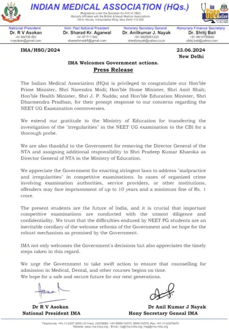 इंडियन मेडिकल एसोसिएशन (IMA) ने NEET UG परीक्षा विवादों के संबंध में एक्शन लेने के लिए प्रधानमंत्री नरेंद्र मोदी, गृह मंत्री अमित शाह, स्वास्थ्य मंत्री जेपी नड्डा और शिक्षा मंत्री धर्मेंद्र प्रधान को धन्यवाद दिया।इसके अलावा, IMA ने NEET UG परीक्षा में अनियमितताओं की जांच को CBI को सौंपने और NTA के डायरेक्टर जनरल को हटाने के लिए शिक्षा मंत्रालय को भी धन्यवाद दिया है।