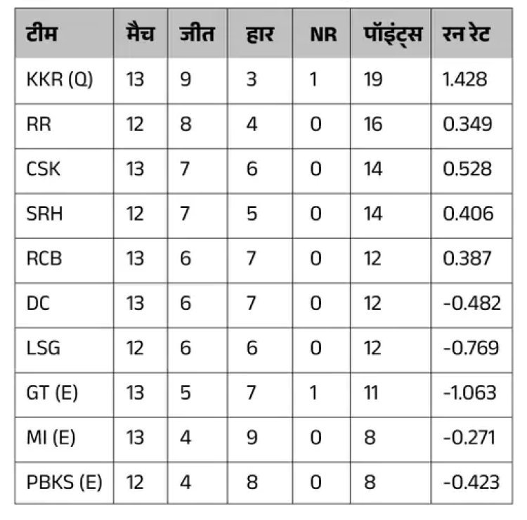 - कोलकाता के अब 13 मैचों में 9 जीत, 3 हार और एक बेनतीजा मैच से 19 पॉइंट्स हो गए। टीम टॉप पर है और उनका टॉप-2 में रहना कन्फर्म है। क्योंकि राजस्थान के अलावा कोई भी टीम 18 से ज्यादा पॉइंट्स हासिल कर प्लेऑफ में जगह नहीं बना सकेगी। इसलिए KKR अब 21 मई को अहमदाबाद में ही क्वालिफायर-1 खेलेगी।