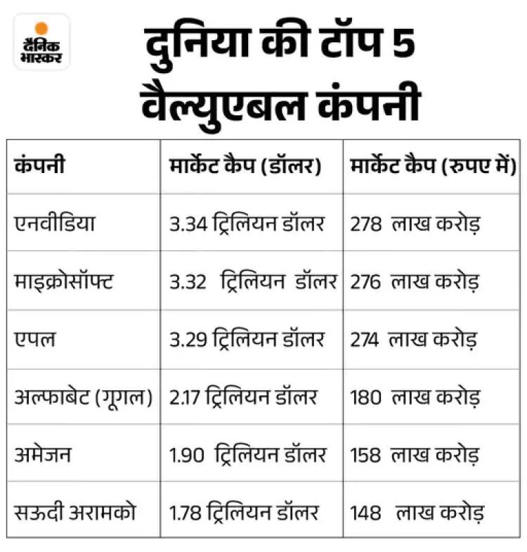 इससे पहले 5 जून को एनवीडिया एपल को पीछे कर दुनिया की दूसरी सबसे वैल्युएबल कंपनी बनी थी। तब एनवीडिया का मार्केट कैप 3.01 ट्रिलियन डॉलर (करीब 251 लाख करोड़ रुपए), माइक्रोसॉफ्ट का मार्केट कैप 3.15 ट्रिलियन डॉलर (करीब 262 लाख करोड़ रुपए) और एपल का मार्केट कैप 3 ट्रिलियन डॉलर (करीब 250 लाख करोड़ रुपए) था।